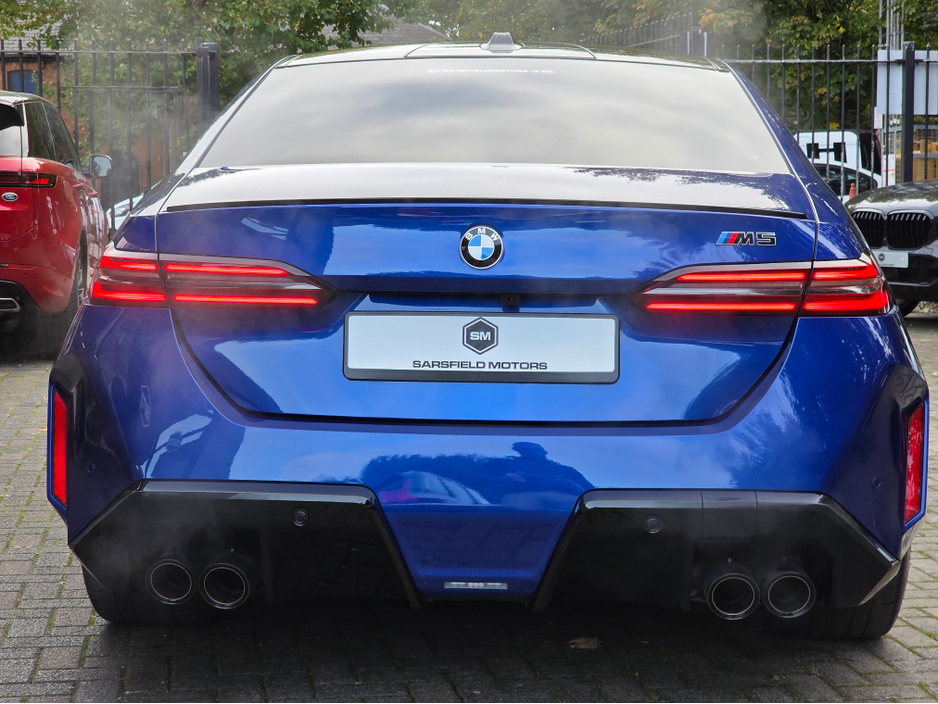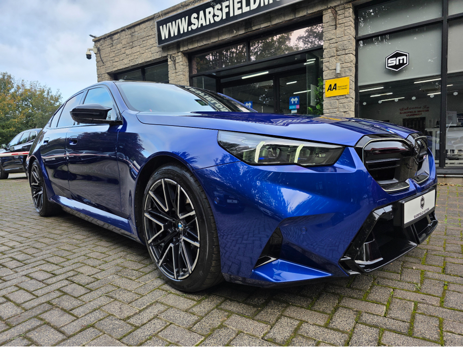 STUNNING 2025 BMW M5 4.4 V8 HYBRID 727 BHP AUTO. DUBLIN PLATE. BALANCE BMW WARRANTY FEB 2028. PRESENTED IN MARIAN BLUE METALLIC FINISHED IN SILVERSTONE AND BLACK BI COLOUR MERINO LEATHER. OPTIONS TO LIST HEAD UP DISPLAY. PANORAMIC GLASS ROOF. COMFORT ACCESS. BMW ICONIC GRILLES. M-SPORT BRAKES WITH BLUE CALIPERS. HIGH GLOSS SHADOWLINE EXTERIOR. 360 CAMERAS. HEATED SEATS. REAR CLIMATE . BOWERS & WILKINS SPEAKERS. BMW SAT NAVIGATION SYSTEM. WIRELESS CHARGING. AUTO LIGHTS. ADAPTIVE HEADLIGHTS. AMBIENT LIGHTING. CLIMATE CONTROL. AIR CON. HUGE SPEC. VIEWING BY APPOINTMENT ONLY 7 DAYS A WEEK. NATIONWIDE DELIVERY AVAILABLE. SIMI DEALER 2025. ONLINE FINANCE IS AVAILABLE ON OUR NEW USER-FRIENDLY WEBSITE. OPEN SINCE 2002. OVER 20 YEARS EXPERIENCE IN THE MOTOR TRADE. FAMILY OWNED. SIMI DEALER. CREDIT INTERMEDIARIES FOR NUMEROUS FINANCE HOUSES. 2 Keys