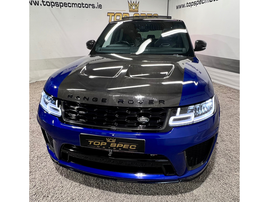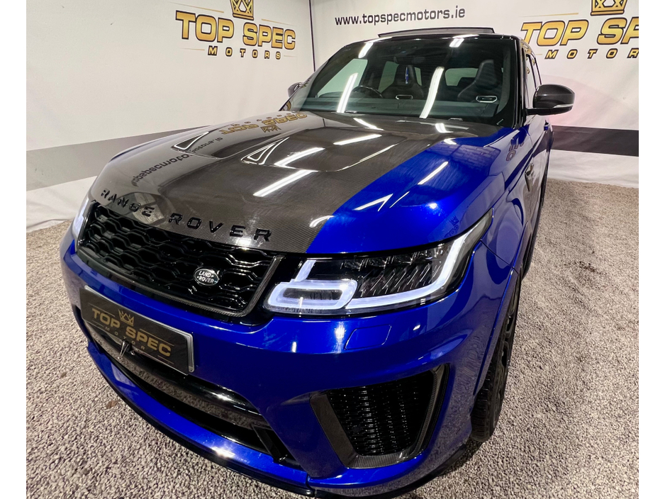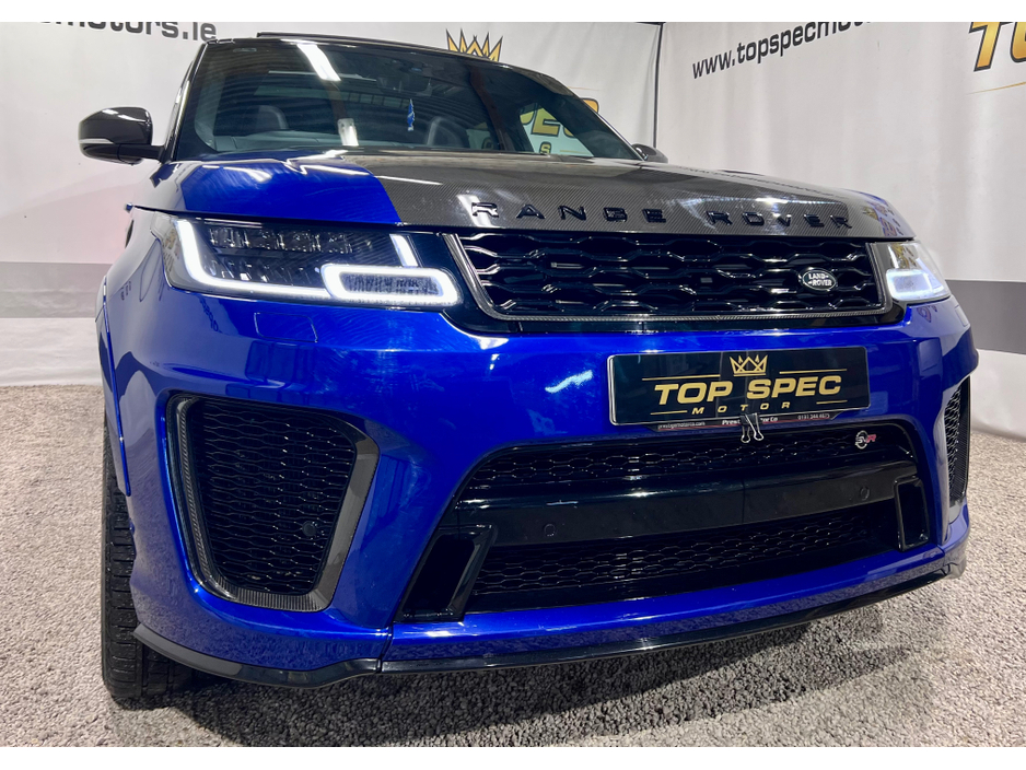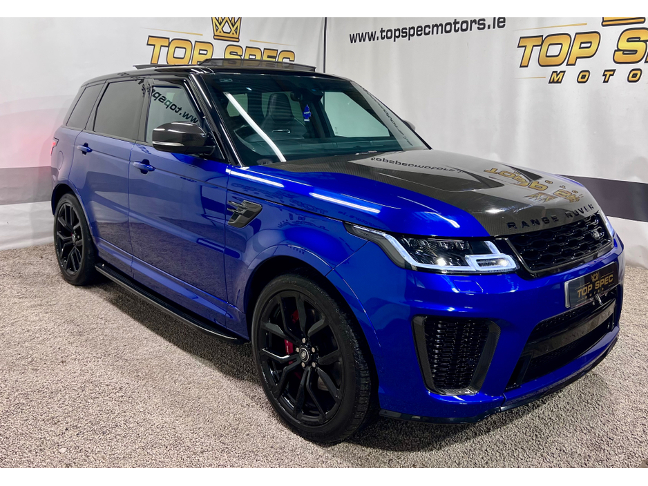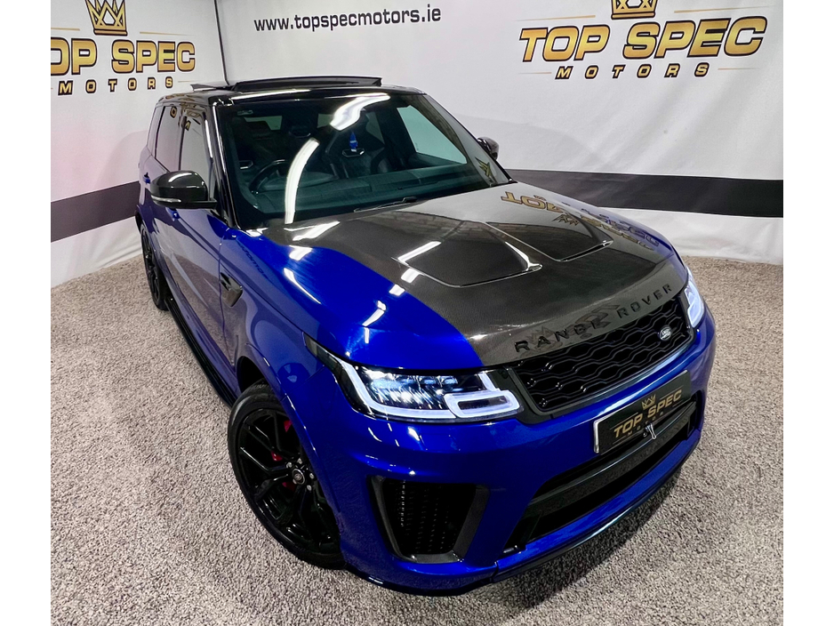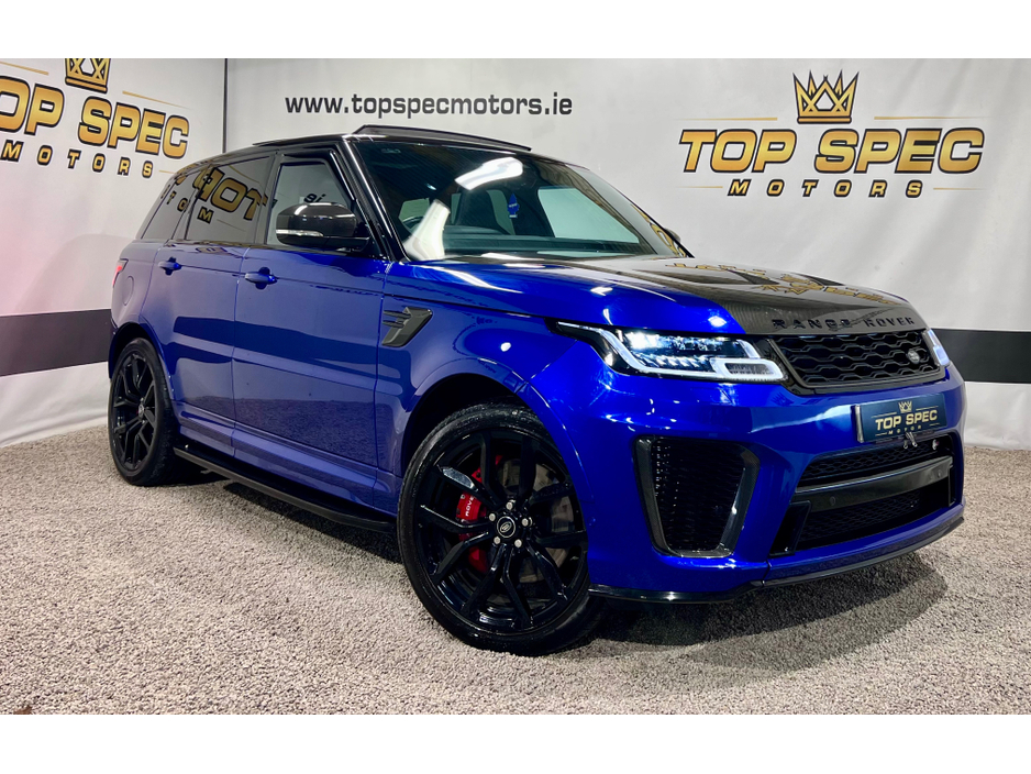 2021 Land Rover Range Rover Sport SVR Carbon Edition 5.0 P575 V8 SVR Carbon Edition Auto 4WD ABSOLUTELY FULLY LOADED CARBON EDITION WITH EVERY EXTRA FULL EXPOSED CARBON BONNET, BUMPER, MIRRORS, SIDE GRILLS,REAR BUMPER, INTERIOR TRIMS ECT. PAN SLIDING ROOF GHOST IMMOBILISER MERIDIAN SOUND SYSTEM PADDEL SHIFT UPGRADE EXHAUSTS SYSTEM FULL SERVICE HISTORY, LAST SERVICED THIS MONTH IN LANDROVER LOYNS OF LIMERICK NEW DISK AND PADS FACELIFT MODEL WITH TWIN TOUCHSCREENS FINISHED IN ESTORIL BLUE METALLIC WITH BLACK CONTRAST ROOF EXTENDED BLACK LEATHER INTERIOR 22" BLACK FACTORY SVR ALLOY WHEELS WITH 4 NEW CONTINENTAL TYRES SVR SPORTS BODYSTYLING EXTENDED CARBON TRIM WITH EXPOSED CARBON VENTED BONNET SWITCHABLE QUAD SPORTS EXHAUSTS SVR SPORTS SEATS SPORTS SUSPENSION SATELLITE NAVIGATION FRONT AND REAR PARKING SENSORS WITH VISUAL DISPLAY AND REVERSE CAMERA KEYLESS ENTRY AND GO WITH PUSH BUTTON START LED DAYTIME RUNNING LIGHTS HEATED AND CLIMATE COOLED SEATS HEATED STEERING WHEEL 2 KEYS DRIVES AS NEW FIRST TO VIEW WILL BUY Mileage only 79k with full dealer service history Can be sold as a 2 seater Commerical or 5 seater passenger,call for more info and price on this option Call sales on 0871925200 Stunning jeep in every way Strictly appointment only Check us out on Facebook for more info top spec motors and follow us on snap chat Finance & Warranty Available Top Spec Motors, Newmarket Co. Cork The prestige and performance specialists FULL 100% FINANCE CAN BE ARRANGED WITHIN 1 HOUR ARRIVE AND DRIVE THE SAME DAY Cork,s Used High Spec Car, Commercial, Motorhome and 4x4 Specialists Card Machine available on site Viewing 7 Days A Week and after 6pm to 11pm by appointment only *FREE NATIONWIDE DELIVERY ANYWHERE* From our forecourt to your front door for no extra cost Click the link below for more info Www.topspecmotors.ie Central Locking, Electric Windows, Airbag, Rear Spoiler, Centre Armrest, Multi-function steering wheel, Satellite Navigation, Traction Control, Anti-Theft System, Parking Sensors, Bluetooth, EBD, Isofix, Active Safety Braking / City Brake / Collision Alert, Stop/Start Button, Touch Screen Media Control, External Devices Connectivity, Cup holders, Remote boot/hatch/rear door release, Stability control