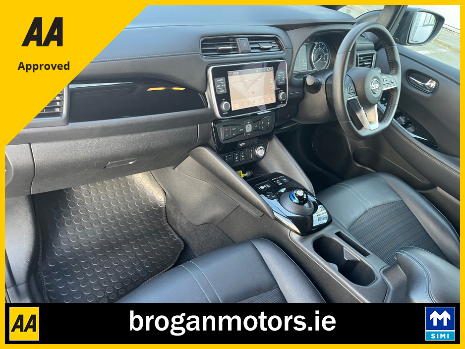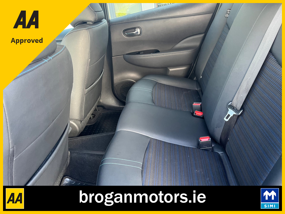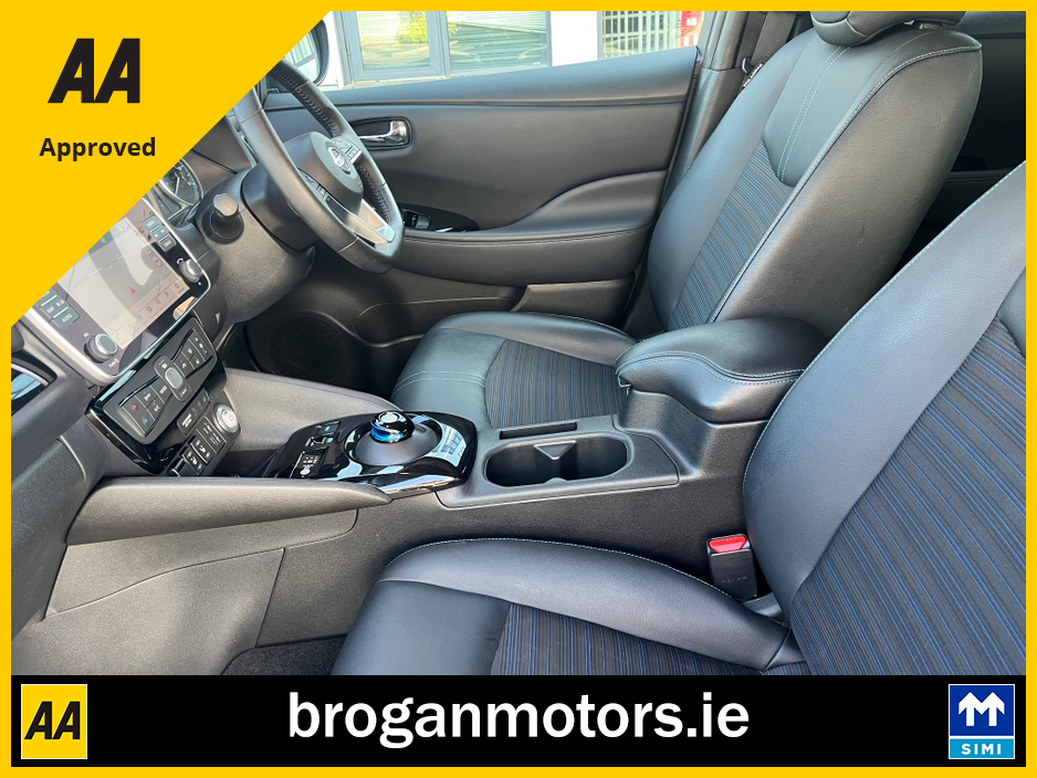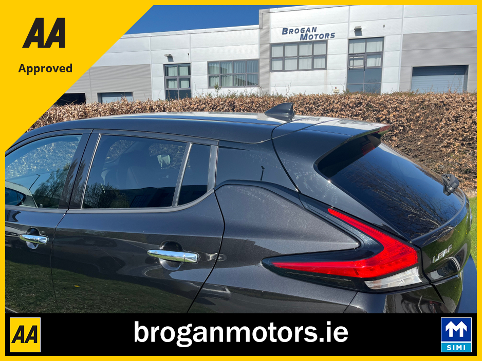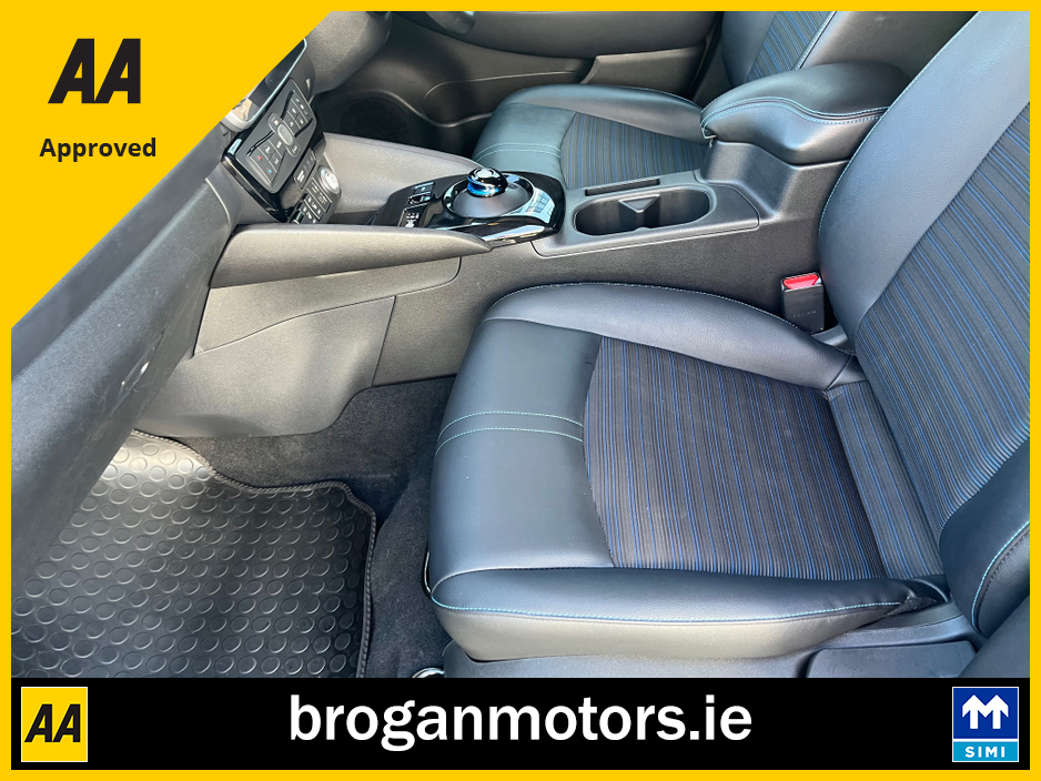 At Brogan Motors Baldonnell, we pride ourselves on the quality of our cars and outstanding aftersales service. We offer competitive and affordable finance packages to suit your needs, and trade-ins are welcome. As a SIMI-approved dealer, we provide a Motorcheck/Cartell history report for your peace of mind. Visit our showroom, 5 minutes from the Red Cow on the N7, to experience the 2022 Nissan leaf EV, With credit/laser card facilities and a 6-month warranty included, your purchase is secure and convenient. Discover the perfect blend of performance, style, and reliability at Brogan Motors Baldonnell today. Air Conditioning, Central Locking, Full Service History, Immaculate condition, Perfect working order, Electric Windows, Airbag, Alloy Wheels, Cruise Control, Electric Mirrors, Fog Lamps, Immobiliser, Leather Upholstery, Rear Spoiler, Half Leather, Privacy Glass, Centre Armrest, Multi-function steering wheel, Climate Control, Satellite Navigation, Traction Control, Multiple Air Bags, Anti-Theft System, Parking Sensors, Bluetooth, Remote Central Locking, EBD, Folding rear seats, Isofix, Roadside assistance, History Checked, Finance Checked, Heated Front Seats, Reversing Camera, Active Safety Braking / City Brake / Collision Alert, Heated Steering Wheel, Touch Screen Media Control, Dual Zone Climate Control, 2 Keys, External Devices Connectivity, Cup holders, Stability control