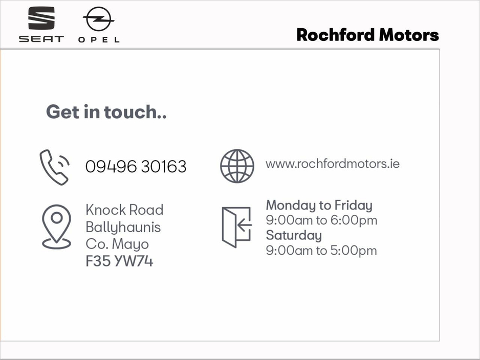 2.9% APR HP Finance over 36 or 48 months 2.9% APR PCP Finance over 36 months Plus €1500 TRADE UP Bonus Driver seat height adjustment Cup holders front Artificial leather, 3-spoke, flatbottom steering wheel Electrically operated front and rear windows with anti-pinch and comfort closing Manual air conditioning Passenger seat 4-way manual adjustment (fore/aft with reclining seatback) Automatic high beam assist with LED Electrochrome anti-dazzle rear view mirror Headlamp levelling system manual Eco LED headlamps Blindspot assist Front and rear parking sensors Cruise control with intelligent speed limiter Lane Keep Assist (LKA) Additional Safety Pack Park & Go pack Eletrical child lock system Remote central locking (2 plip keys) Solar absorbing windows front and rear side and tailgate ECO LED Daytime running lamps Rain sensing front wipers Grained B-pillars 7" Driver information cluster RADIO RECEIVER - ANALOGICDAB 10" colour touchscreen with MirrorLink Apple Car Play / Android Auto MIRROR SCREEN - WITH FRONT SCREEN - SCREEN 10P COLOR SD TACTILE Opel Connect INTERIOR FEATURES Front single dome lamp with dual reading lamps