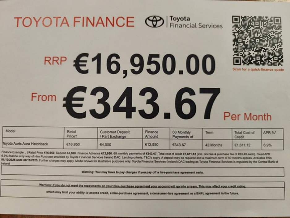 - €190 Annual Road Tax. - Manual gearbox, - Air conditioning, - Power steering, - Remote central locking, - Electric mirrors, - Electric windows, - Alloy wheels, - Fog lights. Welcome to Tadg Riordan Motors Ashbourne, We are a Toyota main dealer established since 1983, conveniently located just off the M2 motorway at the Ashbourne north exit. This car come supplied fully serviced & with a 12 month Toyota Plus Warranty or the balance of manufacturers warranty where applicable, Trade ins accepted & finance available. We have the full range of new Toyota car and commercials on display alongside a great range of quality assured used vehicles. Our sales department are open Mon / Fri 9am - 6pm and Sat 10am - 2pm contact us on (01) 8350084.