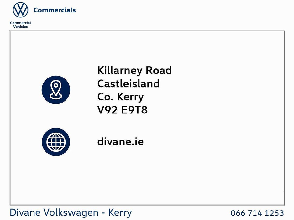 VOLKSWAGEN TRANSPORTER HIGHLINE LWB 2.0TDI 110 BHP 6 SPEED GEARBOX 5 YEAR WARRANTY 5 YEAR SERVICE PLAN 5 YEAR ROADSIDE ASSISTANCE GRAPHITE DUST METALLIC BODY COLOURED BUMPERS MONTE CARLO CALLOYS SUPER BRIGHT 3 LED LIGHTS IN LOAD AREA 7 USB IN CAB CAMERA SESNORS VOLKSWAGEN RETAIL PRICE: €43,700 UP TO €5,000 SCRAPPAGE DIVANES SCRAPPAGE PRICE: €38,700 €31,500 PLUS VAT • Full Service History • Full Vat Receipt Available • VW Bank Finance Available